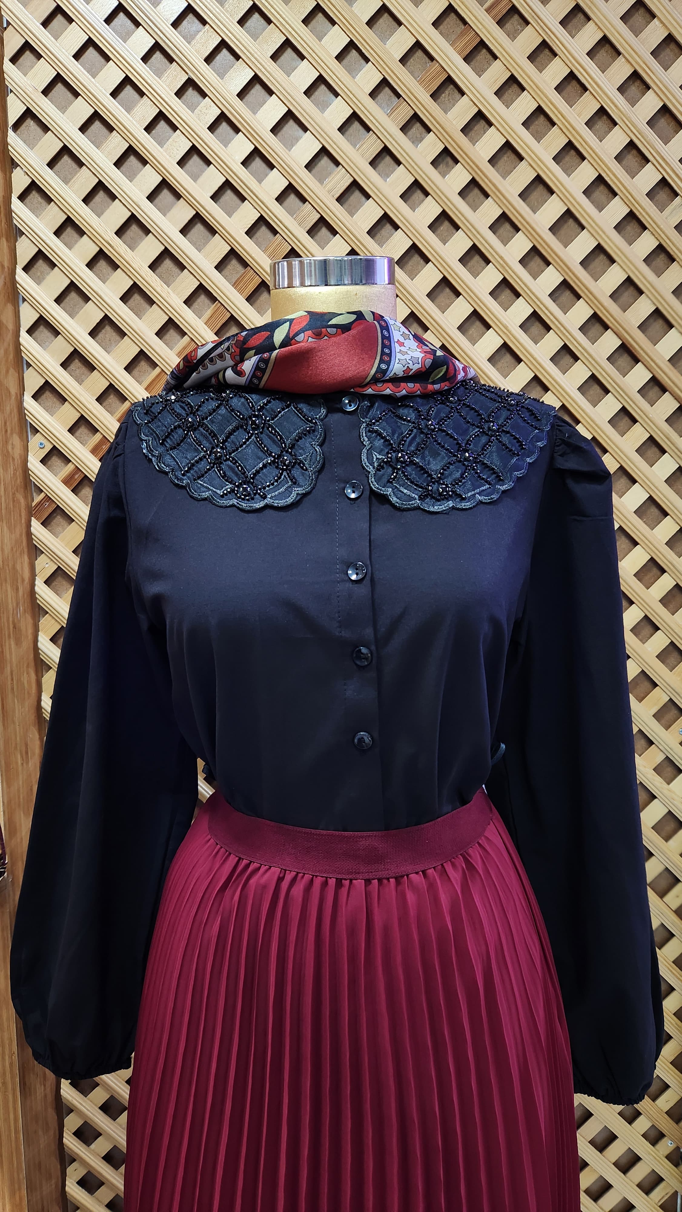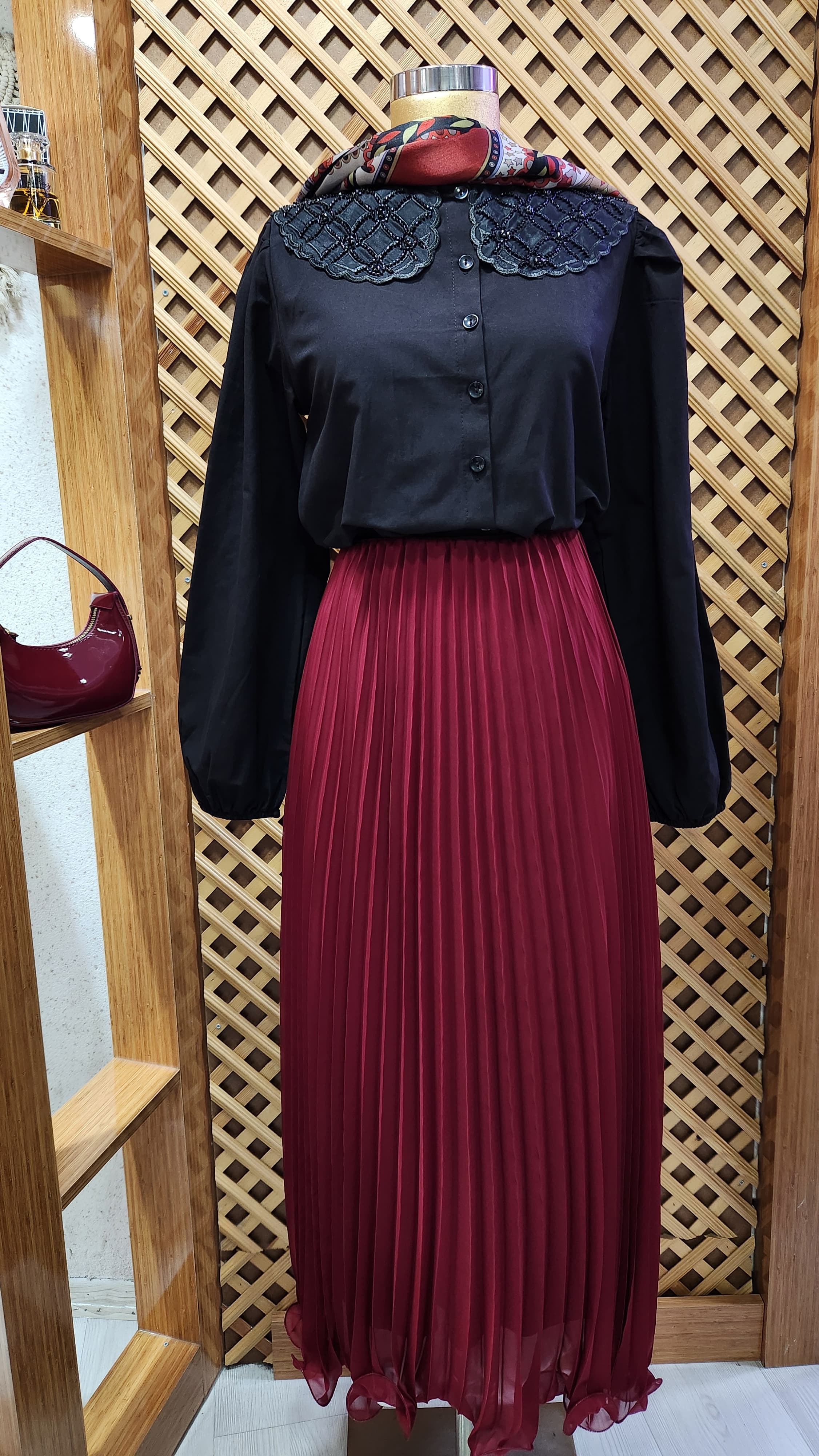 yakası taş detaylı etek üzeri kısa gömlek , bordo ve siyah renkleri mevcuttur